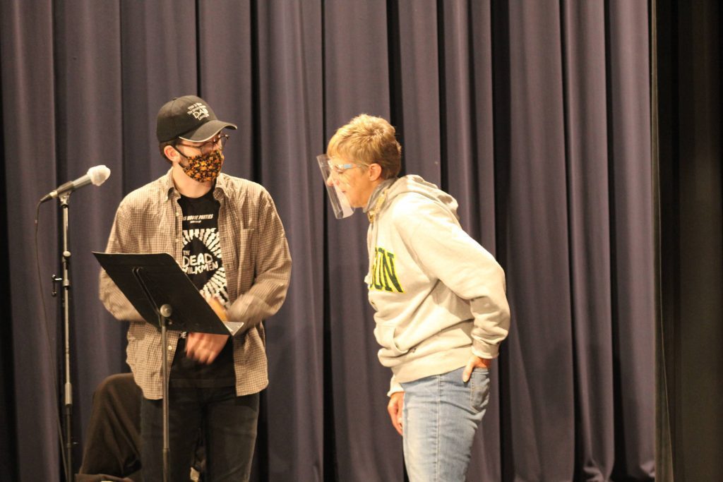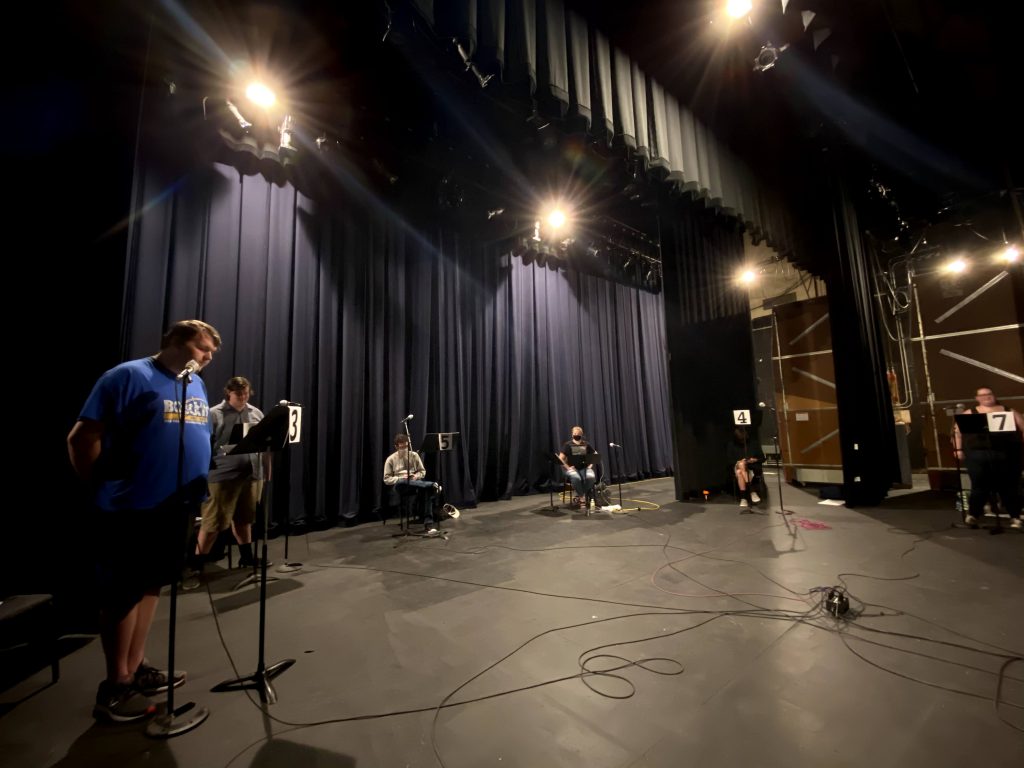 SAU Theatre Department’s recording the fall radio play Enemy of the People, including senior Luke Peterson (far left) .