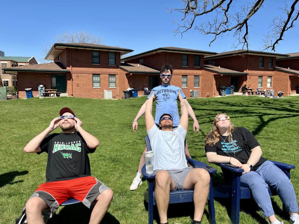 gathered in the quads to witness the celestial spectacle of a recent solar eclipse. This rare