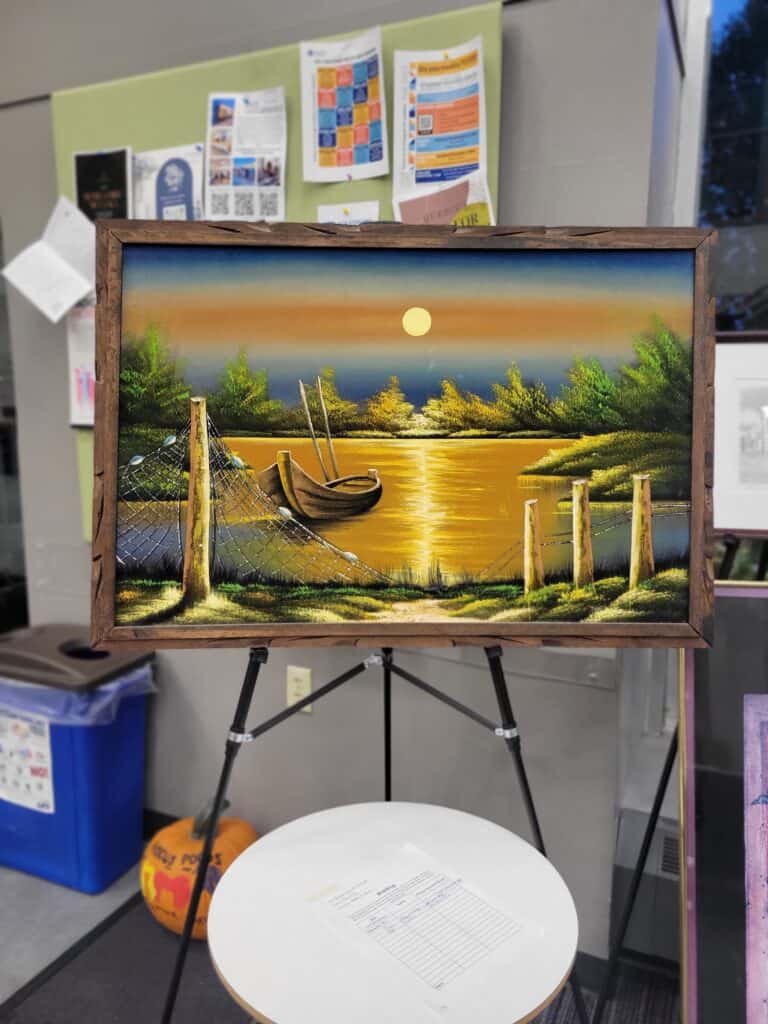 Some pieces included a watercolor painting of Ambrose Hall by John Schmits (below), “Canoeing in the Sunset,” a painting by Heiko + Anna (second below), and a painting of a sunset entitled “Pink Ribbons” by Margaret Babbitt (third below). Of course, these are only a few examples of the many masterful works presented at the auction.