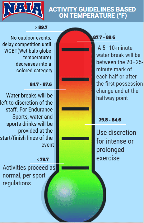 The National Association divides the US regionally into three geographical categories based on their average temperature marks. Davenport, IA, fits into the second category with the temperatures and guidelines marked in the graphic on the side. NAIA classifies its policy into five colored zones according to the degrees measured: green zone, in which activities can proceed as normal, yellow, orange, red, and black, when no outdoor events should be held.
