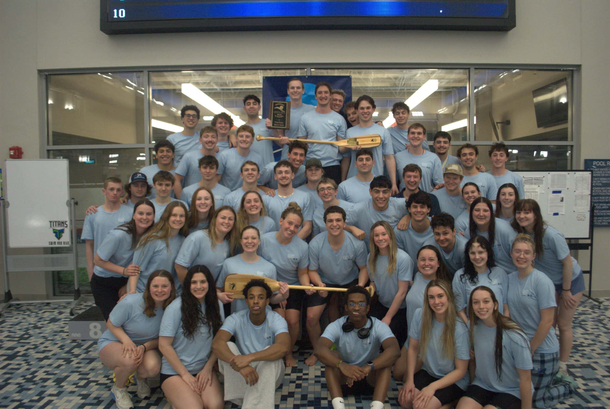 SAU Swim and Dive team poses with the Liberal Arts Conference Trophies