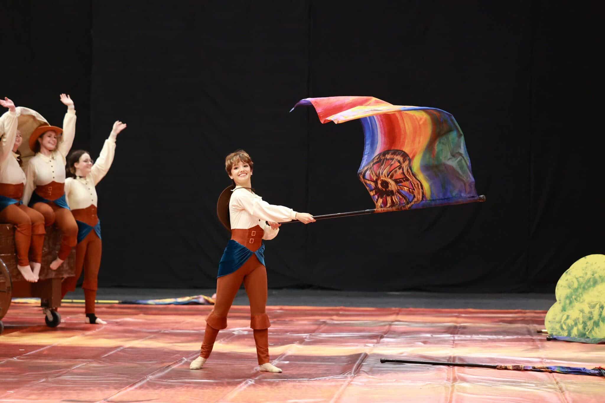 The 2025 program, entitled What We’ve Built, tells the story of a group of pioneers building a wagon to head west. It ends with the underclassmen in the back of the wagon while the seniors wave goodbye. This symbolic theme means a lot to one senior guard member, Olha Huska.