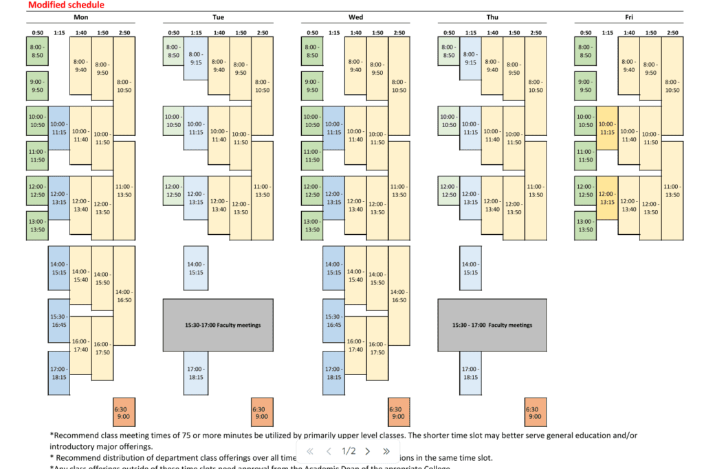 These changes would include the number of offerings on Mondays, Wednesdays and Fridays, from the current three classes a semester to five classes. Balancing out the class offerings offered throughout the week to 10 instead of 8, which was changed due to the COVID-19 pandemic. After outlining the plan to the attendees, the students, faculty and staff in attendance had a chance to voice approval or criticism for the proposed class plan.
