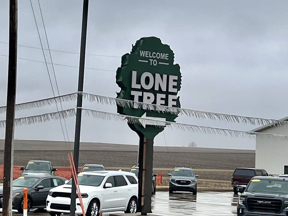 The welcome sign to Lone Tree, IA is in the shape of a tree.