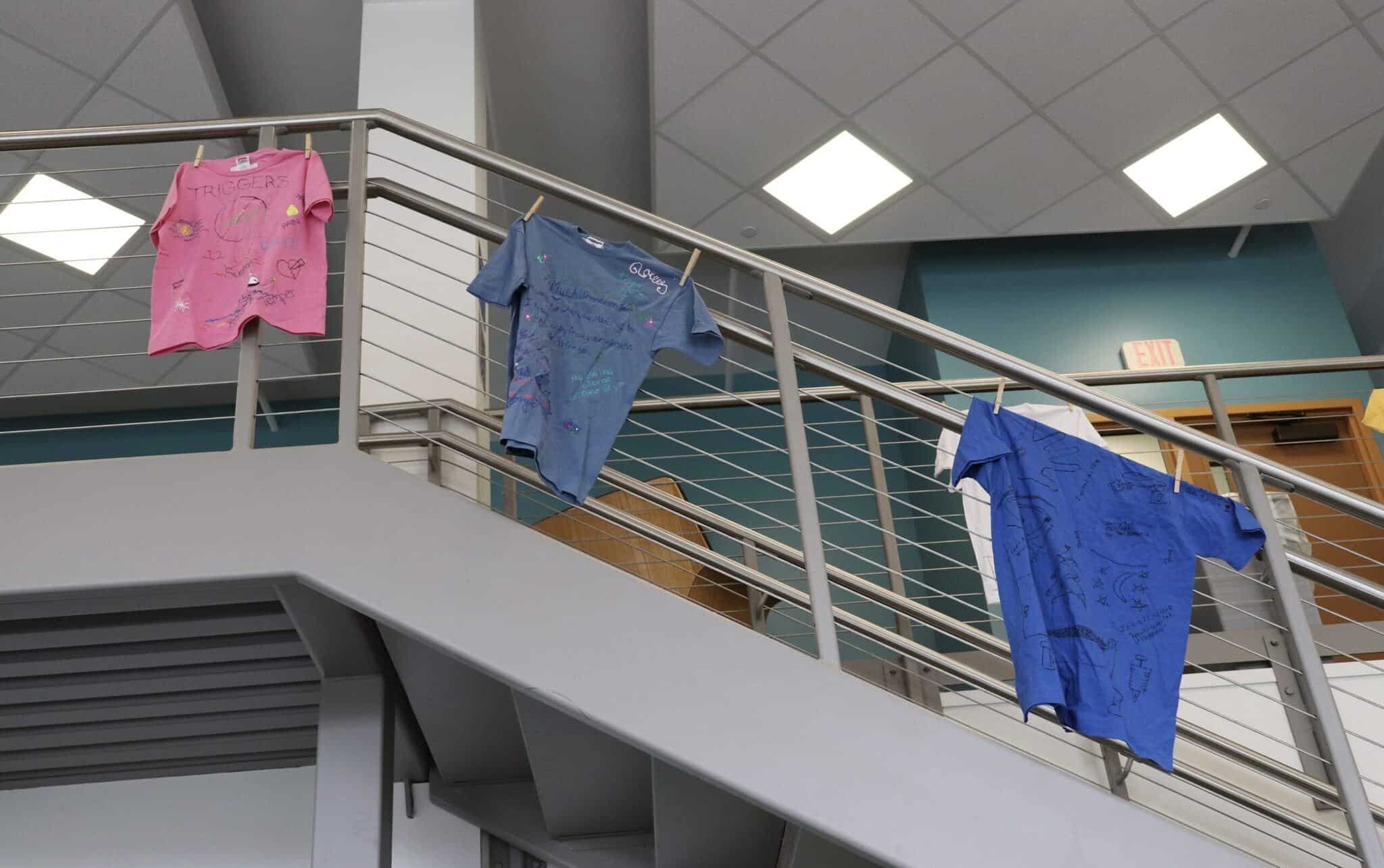 Different colored t-shirts are clipped all around the Beehive. Written on these shirts are stories and statements from survivors of sexual assault.